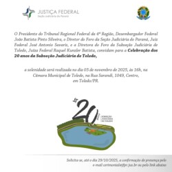 10-11-2005 - Instalação da 1ª Vara Federal de Toledo 13 imagens 14/06/2023 – Inauguração das novas instalações da Subseção Judiciária de Toledo 65 imagens 05/11/2025 – Celebração dos 20 anos de instalação da Subseção Judiciária de Toledo 40 imagens