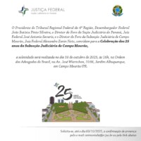 16-06-2000 - Instalação da 1ª Vara Federal de Campo Mourão - Descerramento do Brasão 16 imagens 16-06-2000 - Instalação da 1ª Vara Federal de Campo Mourão - Teatro Municipal de Campo Mourão 34 imagens 14-06-2002 - Instalação do Juizado Especial Federal Adjunto de Campo Mourão 21 imagens 26-04-2006 - Instalação do e-proc em Campo Mourão 14 imagens 08/07/2011 – Entrega do título de Cidadão Honorário de Campo Mourão ao Juiz Federal Substituto Érico Sanches Ferreira dos Santos 39 imagens 15-06-2012 - Inauguração da nova Sede e nominação do prédio - Fórum Ministro Milton Luiz Pereira 12 imagens 09-05-2014 - Instalação da 2ª Vara Federal de Campo Mourão 23 imagens 10/10/2025 - Celebração dos 25 anos de instalação da Subseção Judiciária de Campo Mourão 82 imagens